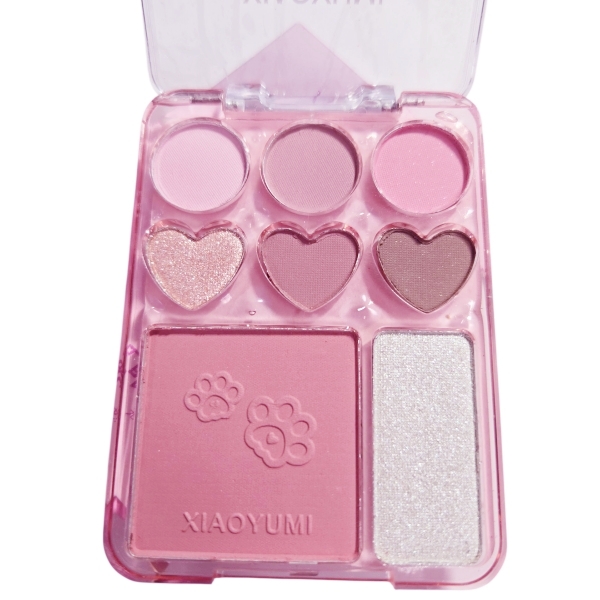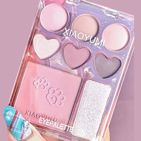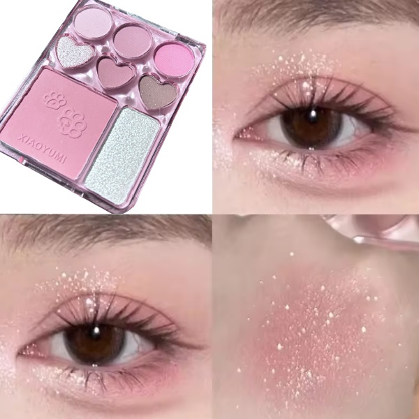 セミマットとラメを使った6色のアイシャドウと桃色のチーク、さらにお顔を明るく惹きたてるハイライトを1つのパレットに収納した本格的メイクパレットが登場!